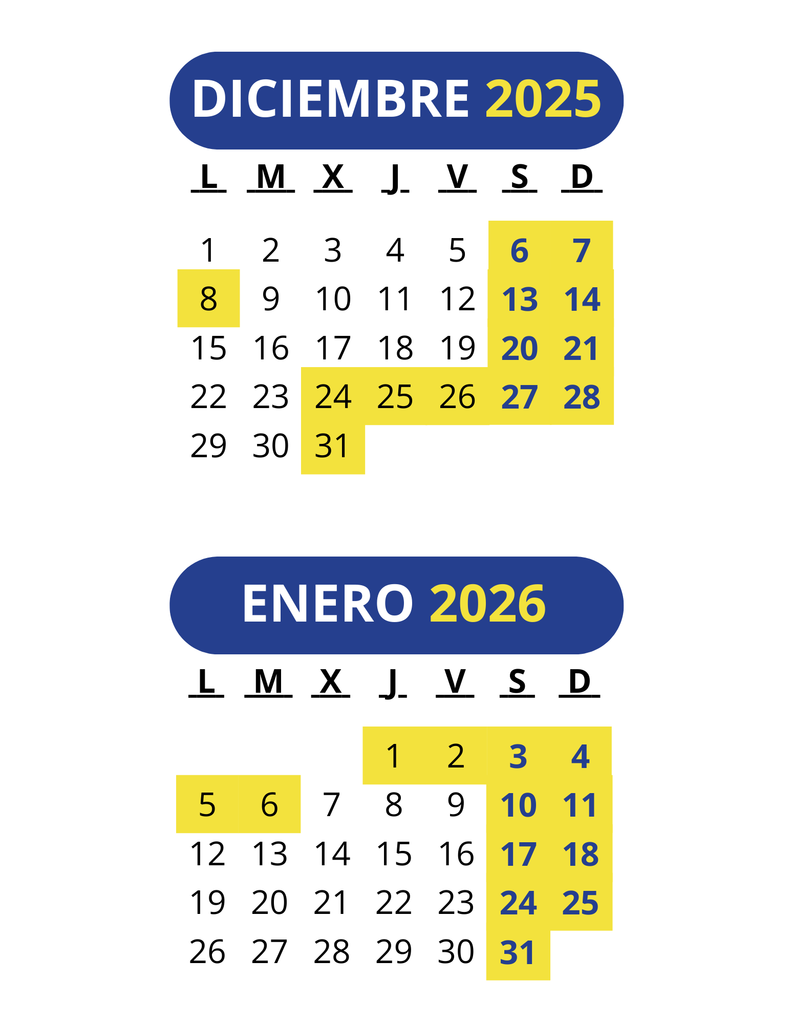 DÍAS FESTIVOS DE DICIEMBRE 2025 Y ENERO 2026