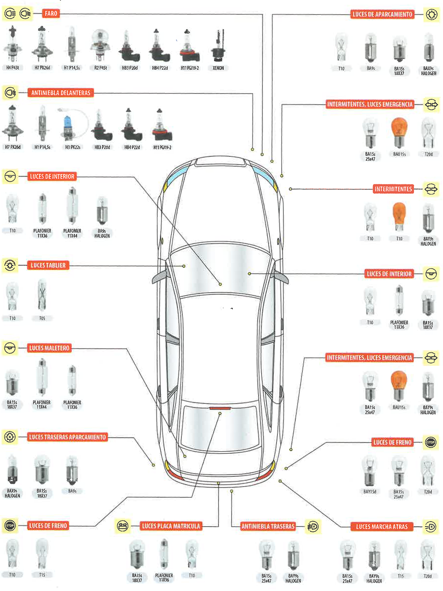 En los siguientes esquemas pueden ver los distintos tipos de lámparas que se usan en cada parte del vehículo, tanto de coches como de camiones y su remolque.
