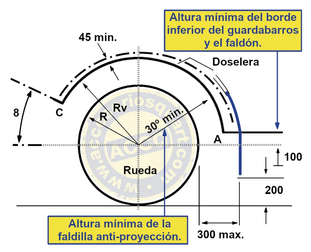En el siguiente esquema podrán ver detalladas las medidas para una correcta colocación y uso de guardabarros y faldones en relación a las ruedas.